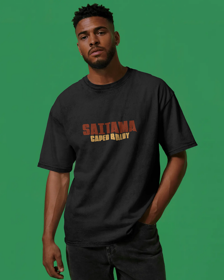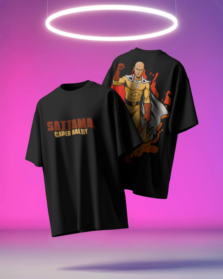 Celebrate the unstoppable power of Saitama, the iconic hero from "One Punch Man," with this Caped Baldy oversized graphic t-shirt. Designed for true anime fans, this bold tee features a striking illustration of Saitama in full hero regalia, confidently stepping forward with his trademark grocery bag and flowing cape. The vivid print captures his legendary status and effortless cool, making it perfect for conventions, hangouts, or daily wear.